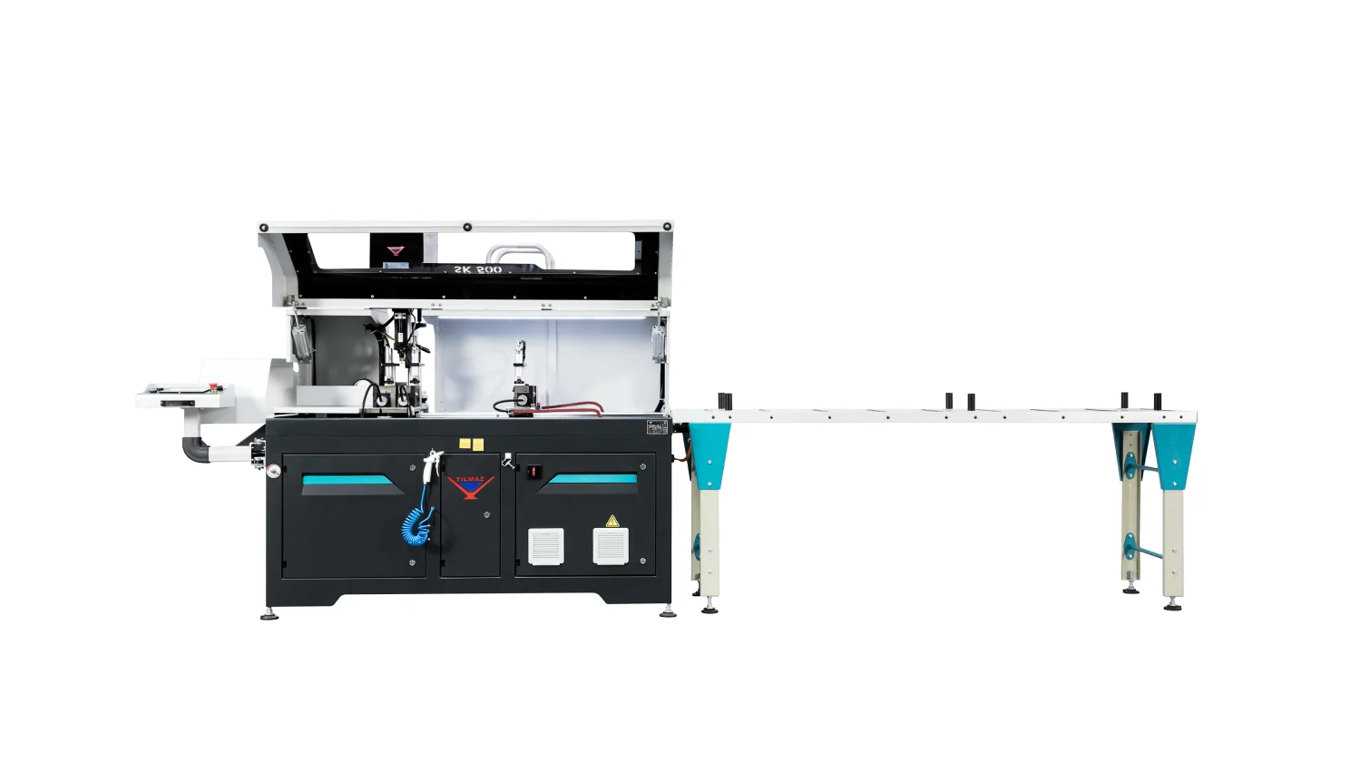 The Yilmaz SK 500 D is an automatic drilling and cutting machine for aluminum profiles, designed for high-volume production. It builds on the SK 500 platform by integrating a servo-controlled drilling unit alongside the 500 mm up-stroke cutting blade. This allows the machine to perform both 90° cutting and vertical drilling operations in a single, automated cycle, making it a highly efficient solution for fabricating components that require both cutting and hole-making