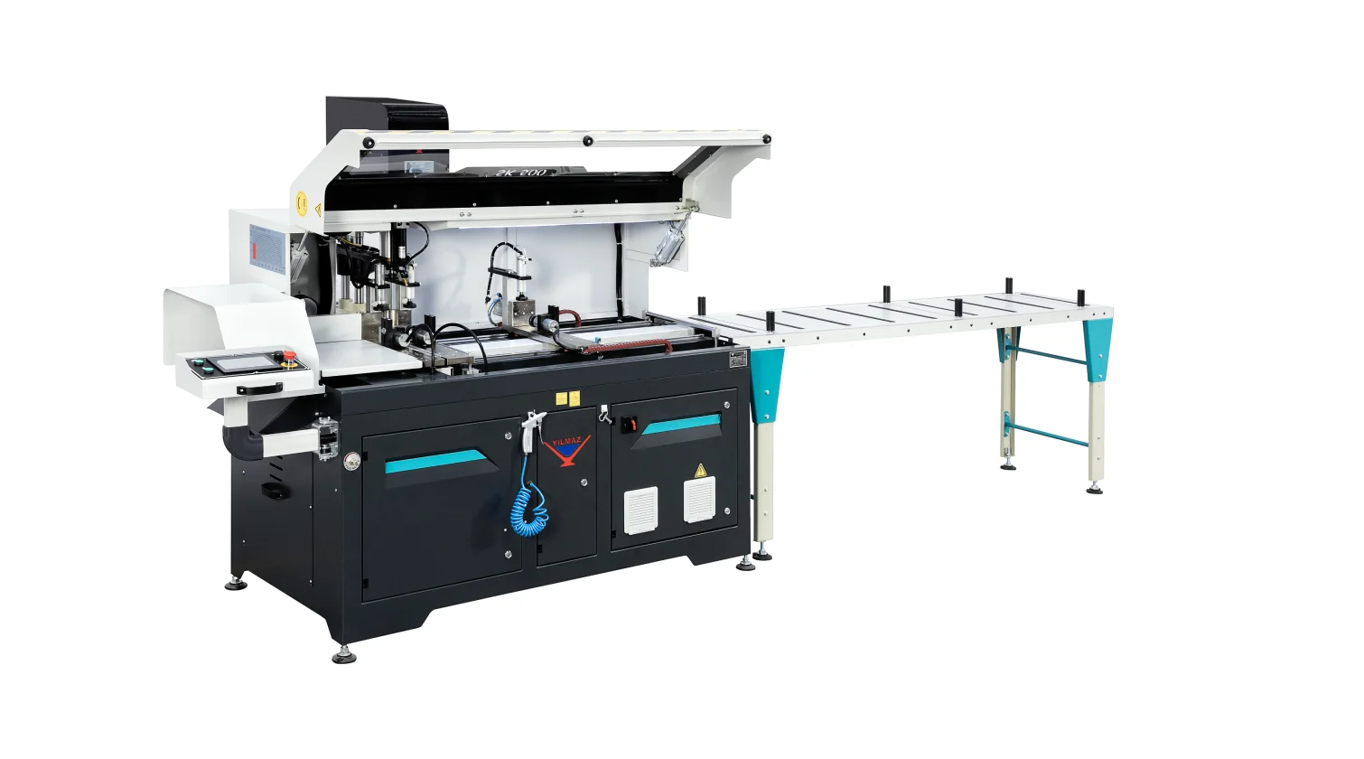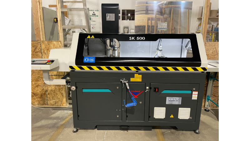 The Yilmaz SK 500 D is an automatic drilling and cutting machine for aluminum profiles that combines 90° cutting with vertical drilling for aluminum extrusions. The machine's process is fully automatic, controlled by a PLC and high-precision servo motors. The operator can manage all parameters and cutting lists via the 7" color touch screen. Transferring a cutting list from a text file (csv format) via a USB memory stick is also available as a standard feature.
