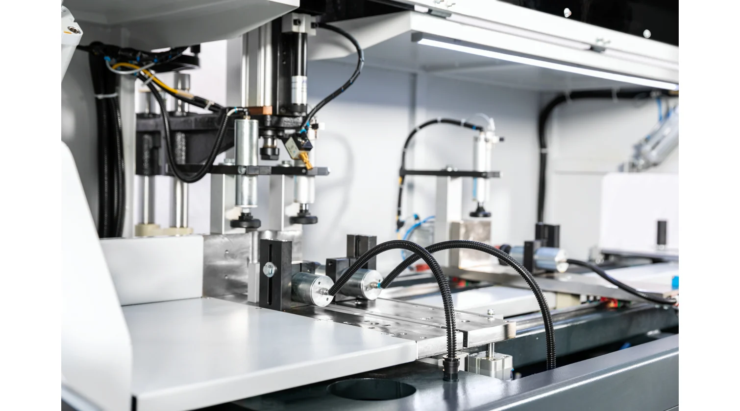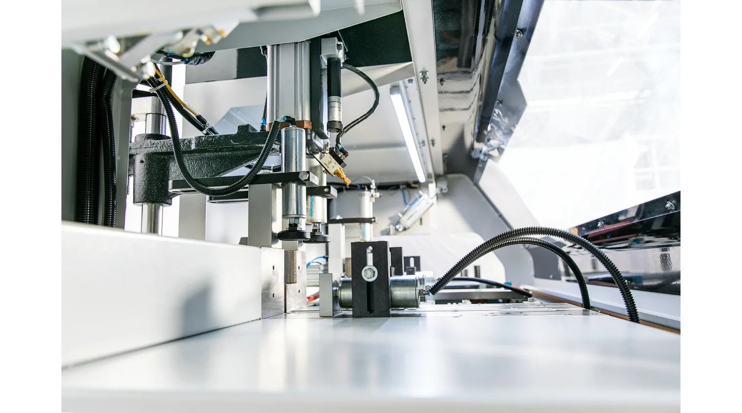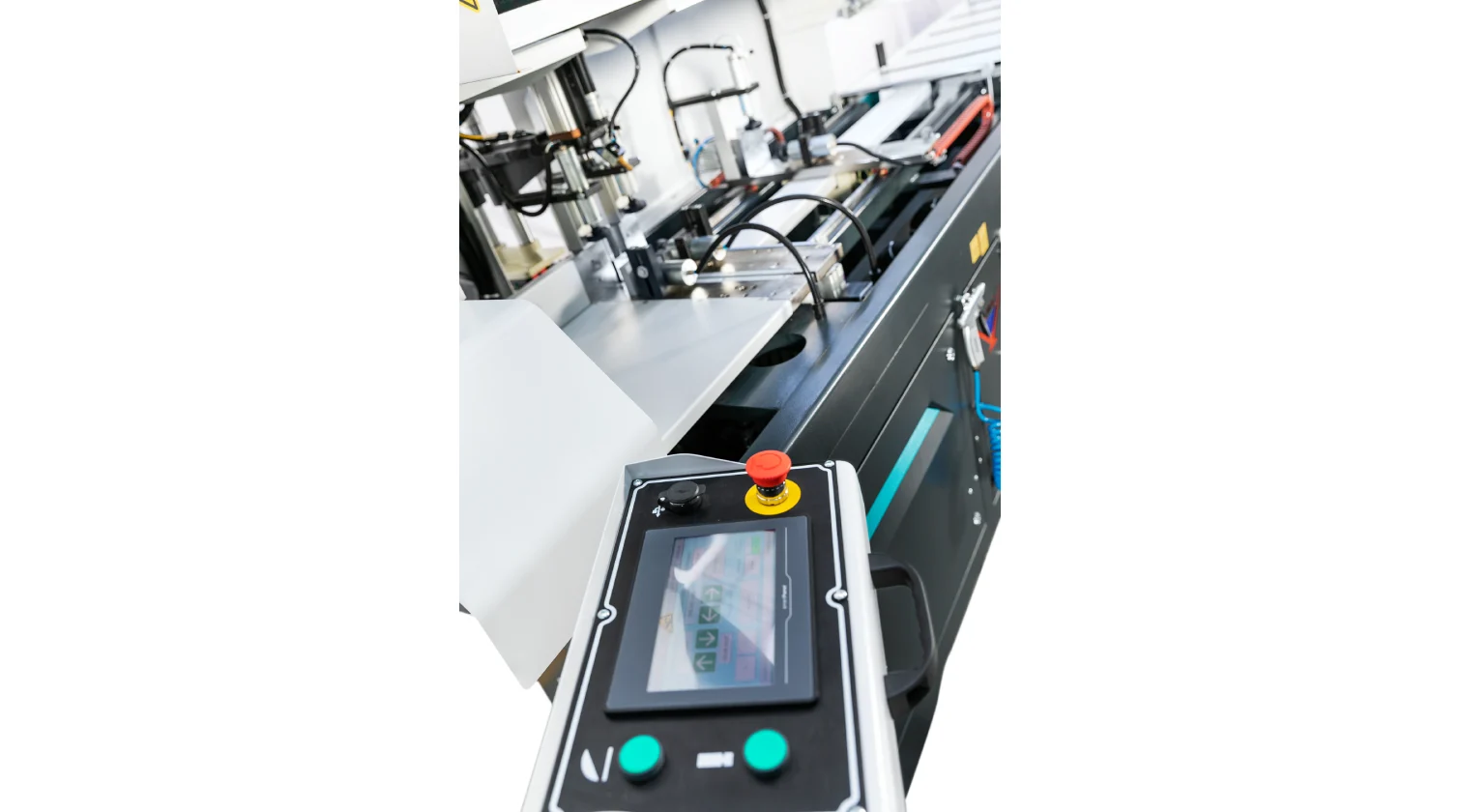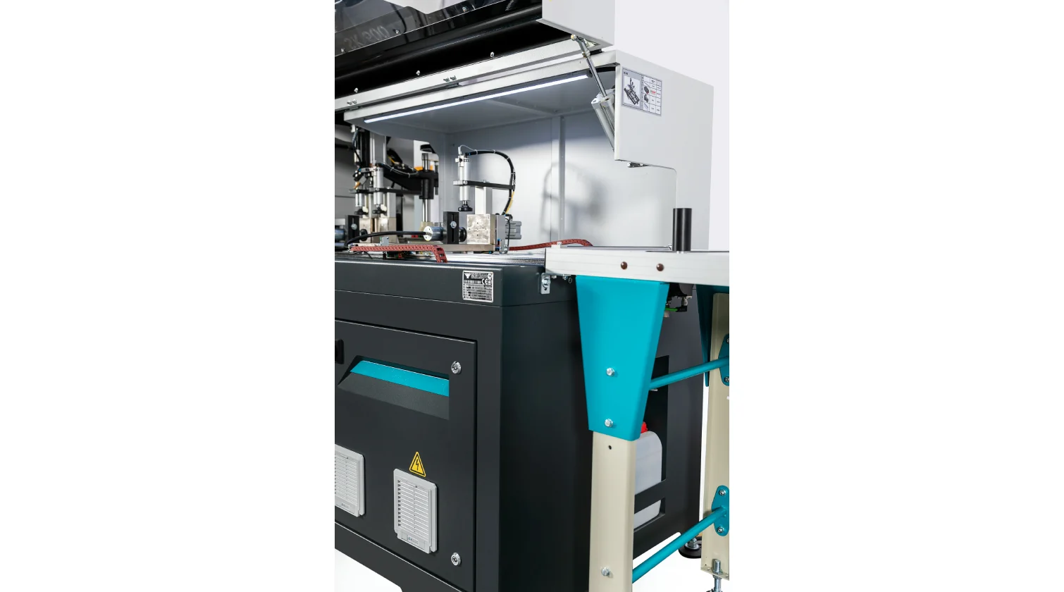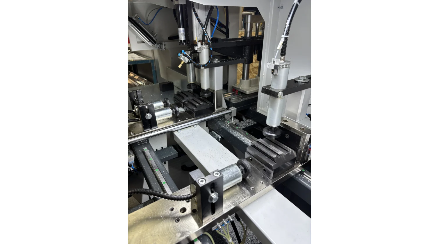 The integrated drilling unit features a servo-controlled Y-axis for precise radial hole positioning, while the material feeder sets the axial (X-axis) position. A hydro-pneumatic dual-speed actuator ensures a rapid and controlled drilling stroke. After drilling, the profile is advanced to the cutting station, where a 500 mm blade performs the final 90° cut.