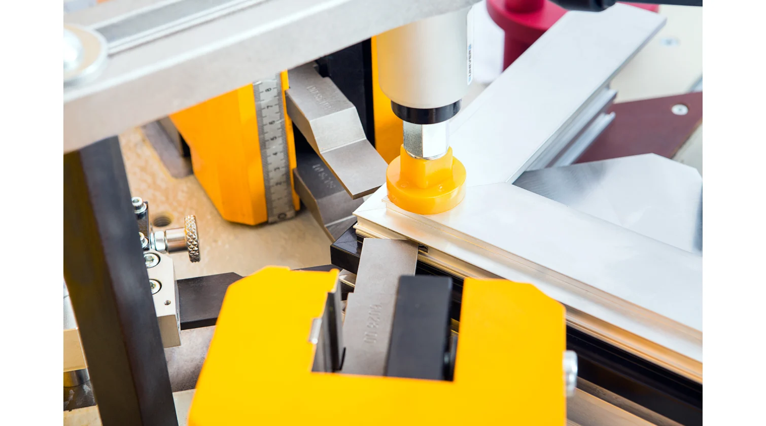 Profiles of various shapes and heights can be secured quickly using the machine’s adjustable magnetic knife support and pneumatic vertical clamps. A double-acting bracing clamp rises from beneath the table to center the profile squarely, ensuring perfect alignment before crimping begins. Positioning values are read easily using metric scales for fast setup and repeatability.