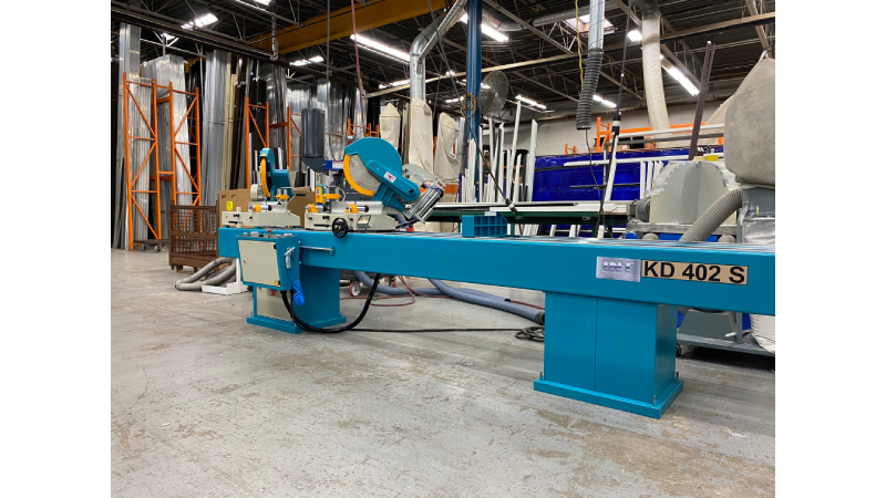 Le Yilmaz KD 402 S est une scie à double tête à descente verticale, conçue pour les coupes droites et en onglet de profilés en aluminium, PVC et bois. Elle est équipée d’une tête de coupe gauche fixe et d’une tête droite mobile positionnée manuellement. L’opérateur définit la longueur de coupe en se référant à un affichage numérique et bloque la tête mobile à l’aide d’un frein pneumatique.