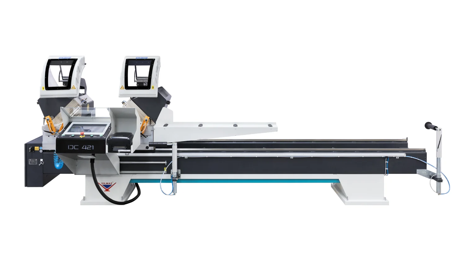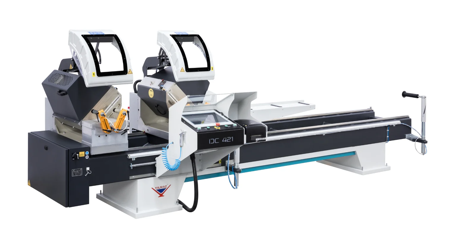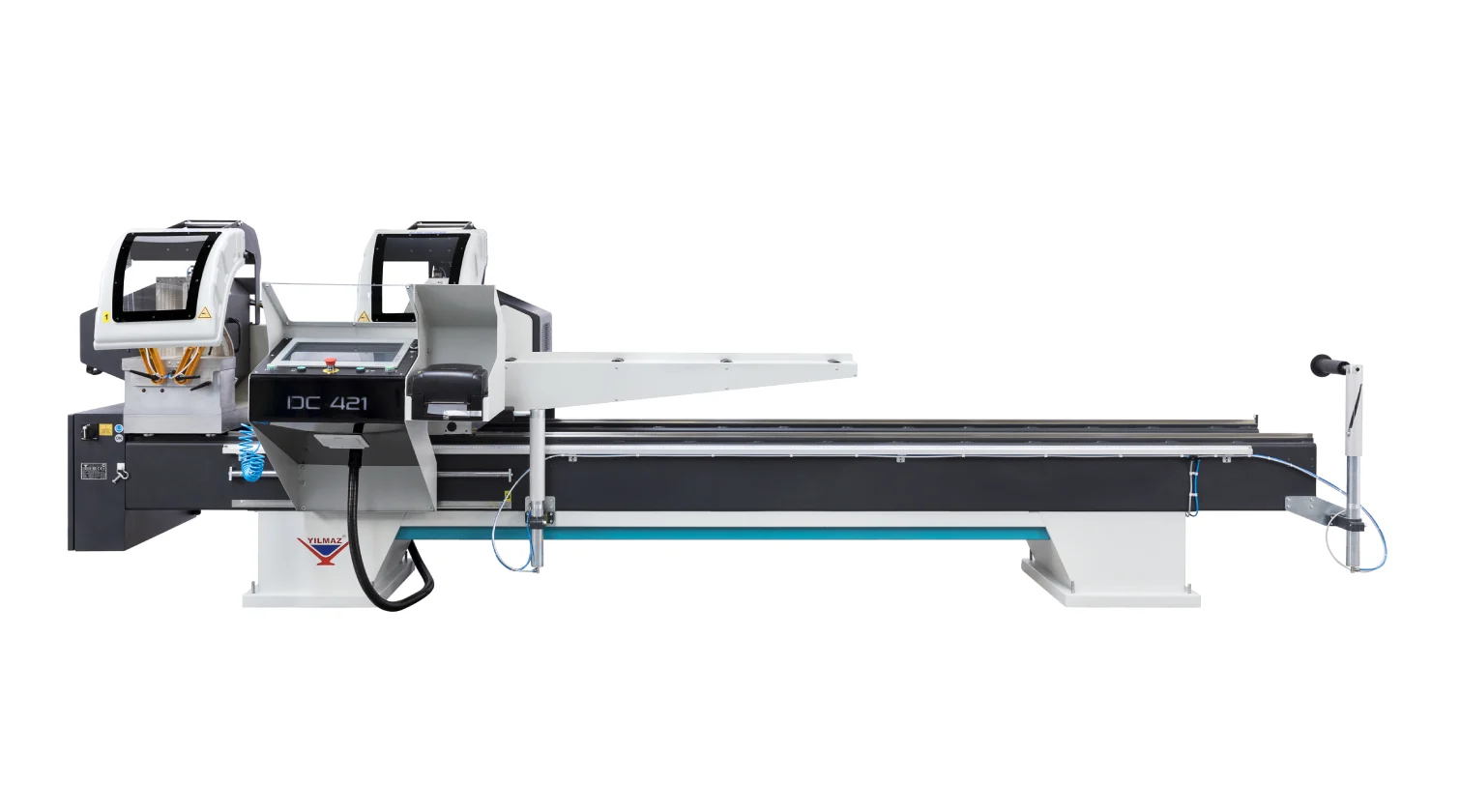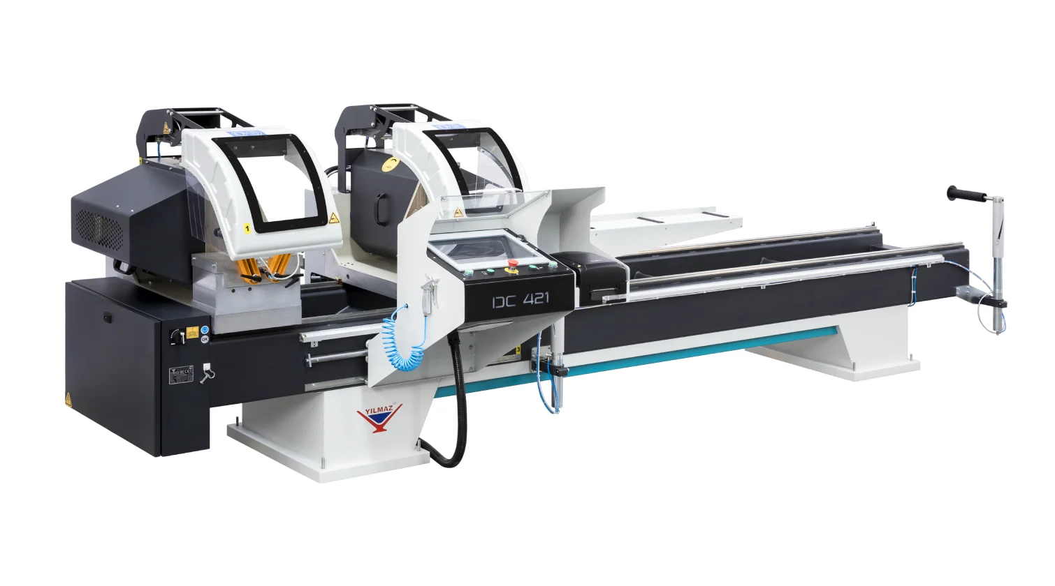 Le Yilmaz DC 421 est une scie à double tête conçue pour la coupe droite et à onglet de profils en aluminium et PVC. La machine repose sur une base en acier solide et comporte une tête de coupe gauche fixe et une tête droite mobile. Les modèles PSD et PBS sont équipés d’un positionnement servo-assisté de la tête mobile pour un réglage rapide et précis de la longueur.
