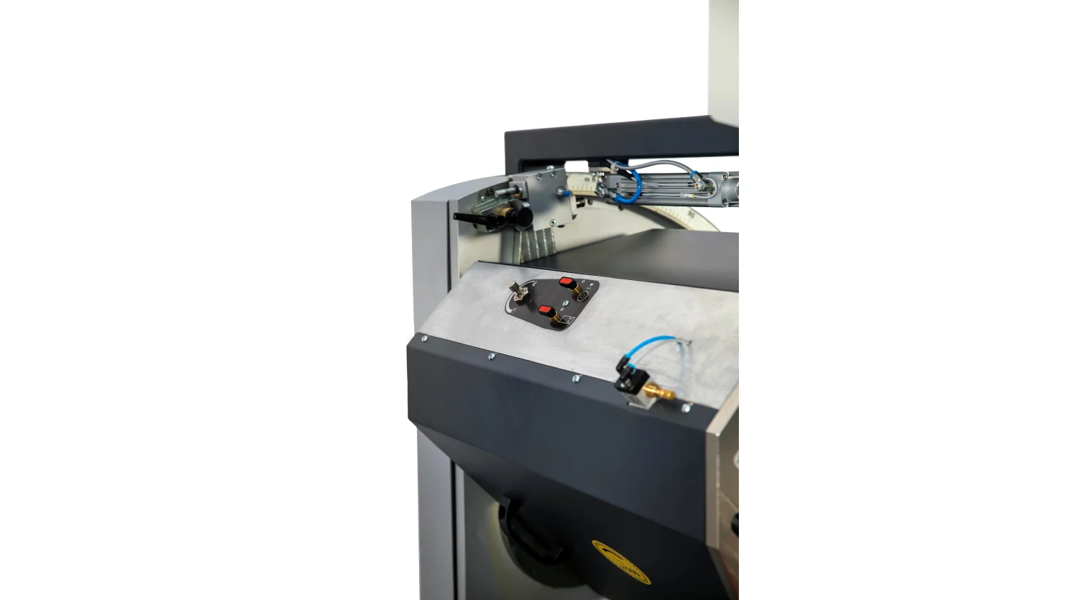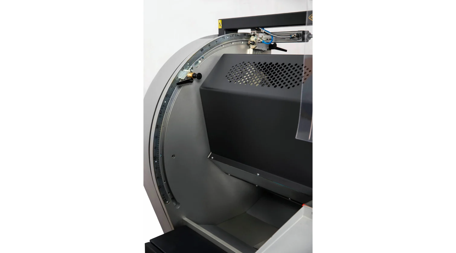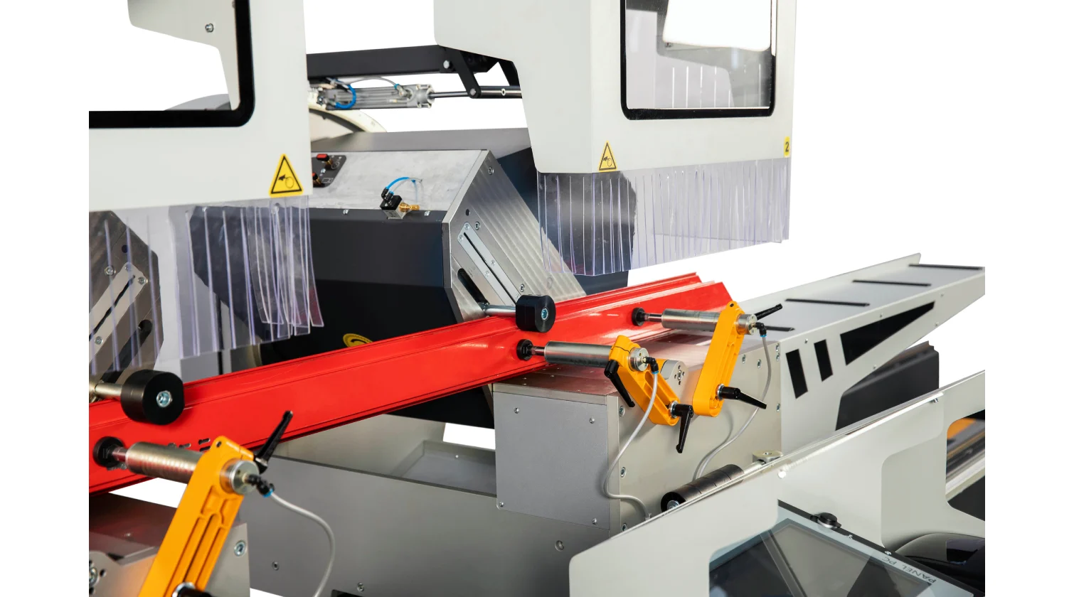 Les performances de la machine reposent sur ses têtes de coupe servo-commandées, équipées de lames de scie de 550 mm. Les têtes peuvent s’incliner automatiquement et avec précision à n’importe quel angle vers l’intérieur jusqu’à 45° et vers l’extérieur jusqu’à 22,5°. Une avance hydro-pneumatique de la lame garantit une coupe fluide et contrôlée pour une finition de haute qualité. L’ensemble du système est piloté par un PC industriel sous Windows avec écran tactile de 15", permettant le transfert de listes de coupe via USB ou réseau et offrant la possibilité d’un support technique à distance. Le modèle DC 550 SKH améliore encore l’automatisation grâce à un système de mesure de la hauteur du profilé en standard.