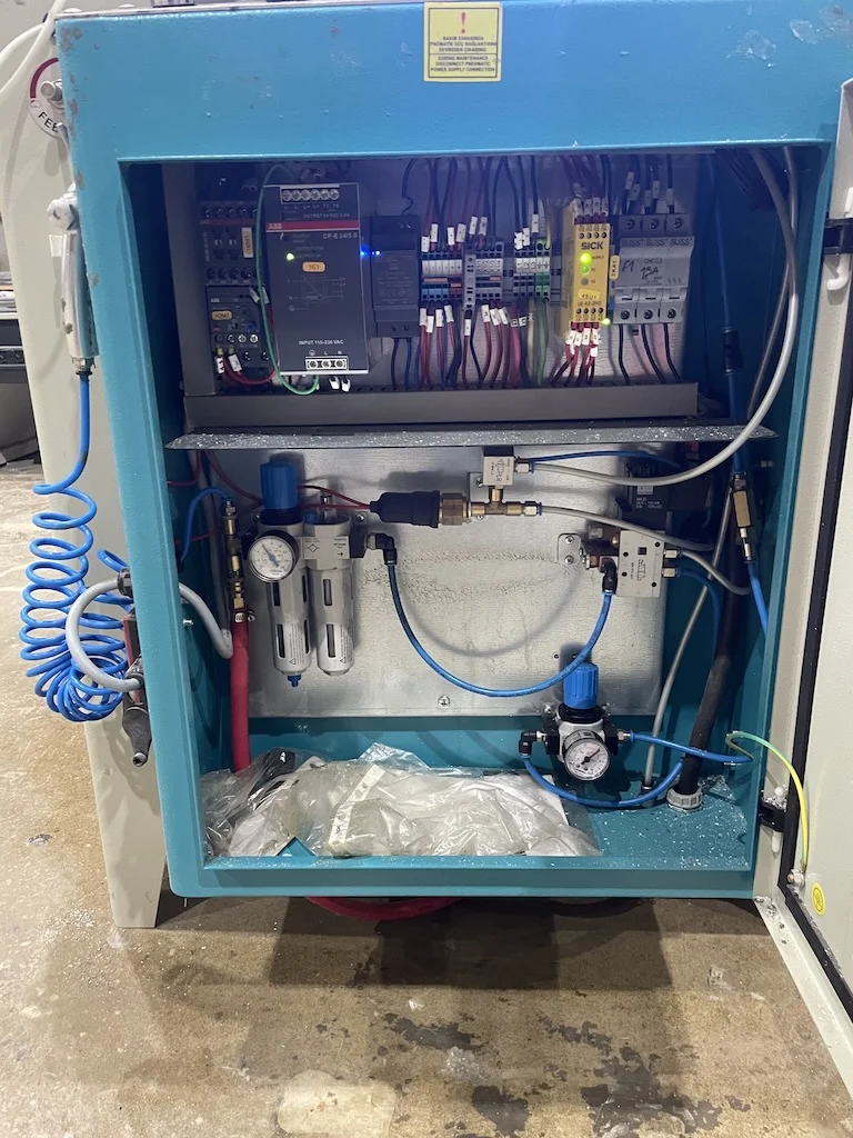 ACK 420 up-cut Miter Saw is designed for straight and miter cutting aluminum and PVC profiles. Blade is raised up by means of a hydro-pneumatic cylinder. Operator holds the two push buttons to raise the the blade up until the cut is completed. As soon as the one or both buttons released, blade will return. Table can be rotated towards both sides for mitre angles down to 15°. Safety hood is operated manually. Machine tested for functionality by INT technicians before being disconnected. Complete with laser line.